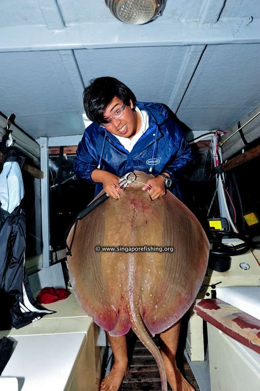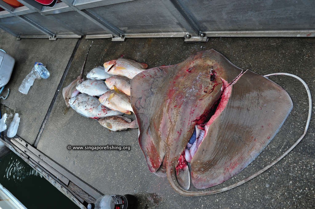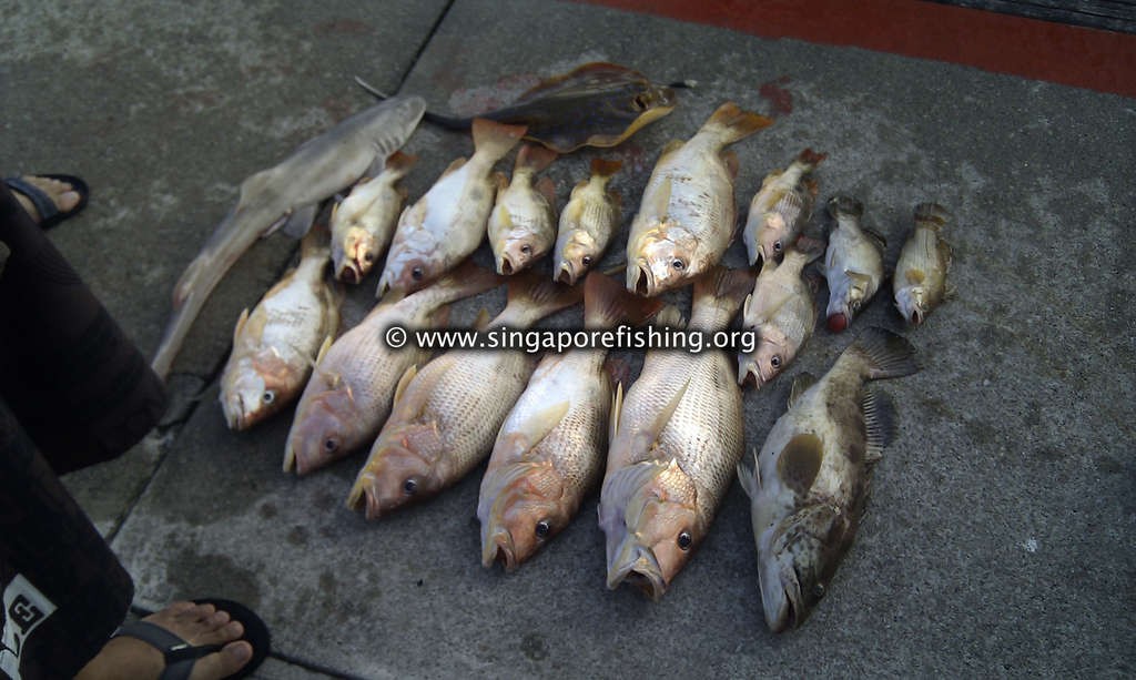 Because I wrote this post so long after the fact, because I received the photos quite late, I cannot recall who’s fish is whose. I seem to remember catching all the fish that day (including one small shark that was released). Yet I do not recall catching the small stingray and the small gao he nor the smallest “parrot fish” (?). This was my biggest bottom fishing haul to date with the stingray and the Ang Cho and the “Ang Kuey” (?) being the biggest I’ve caught!